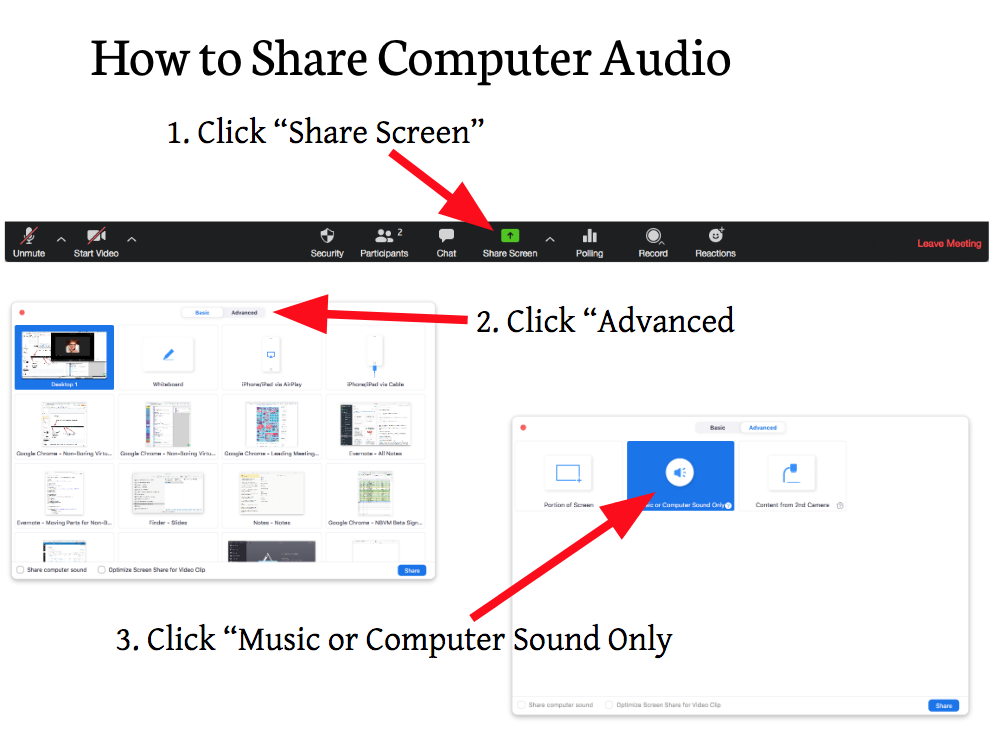 Sharing audio through your computer system on Zoom is done through the Share Screen icon.