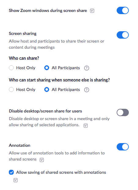 Before you can share your screen, you’ll need to make sure you have your settings on your Zoom account (at zoom.us) set to allow screen sharing.