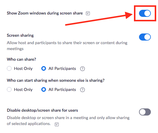 Under Settings > In Meeting (Basic), make sure “Show Zoom windows during screen share” is set to “on” as shown below: